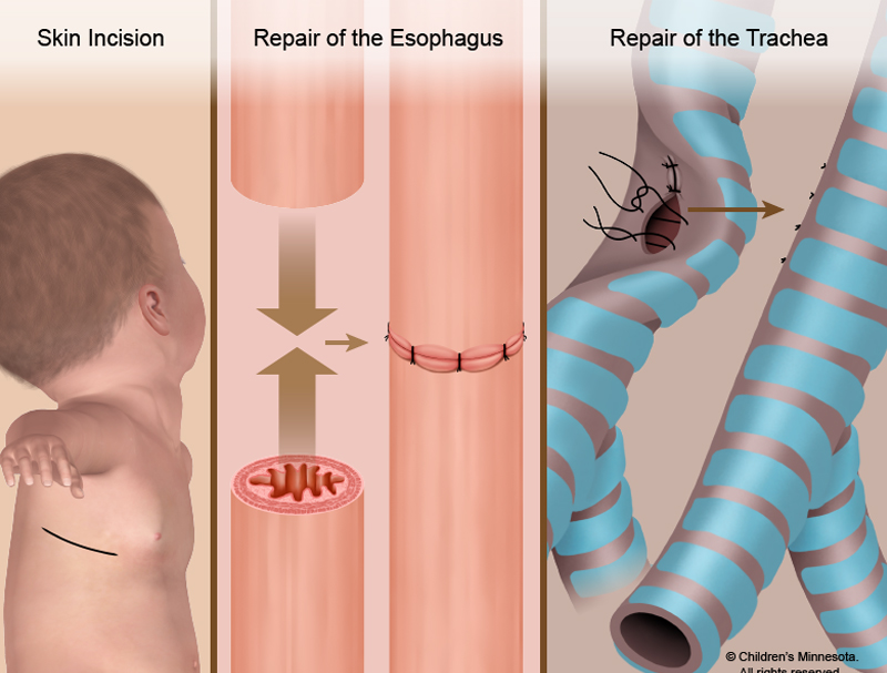 The definitive treatment for EA/TEF is surgical repair performed shortly after birth. The surgery involves: